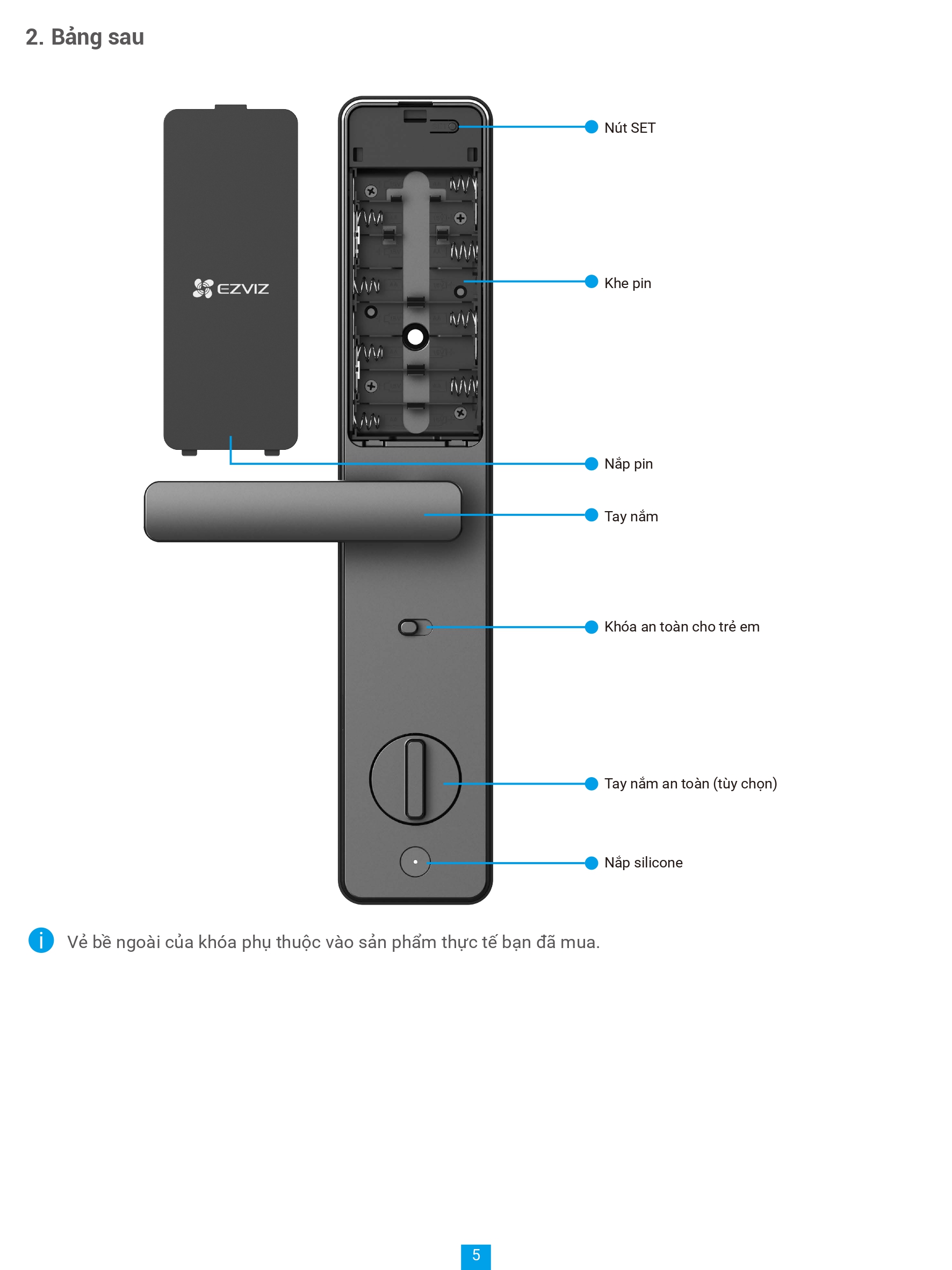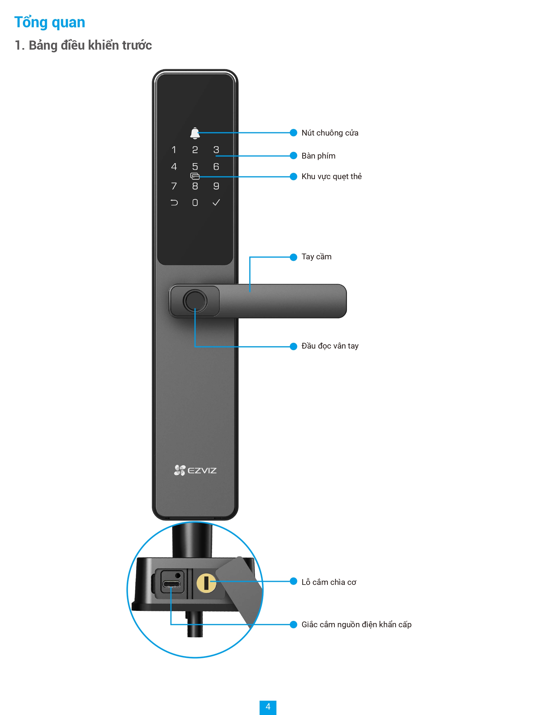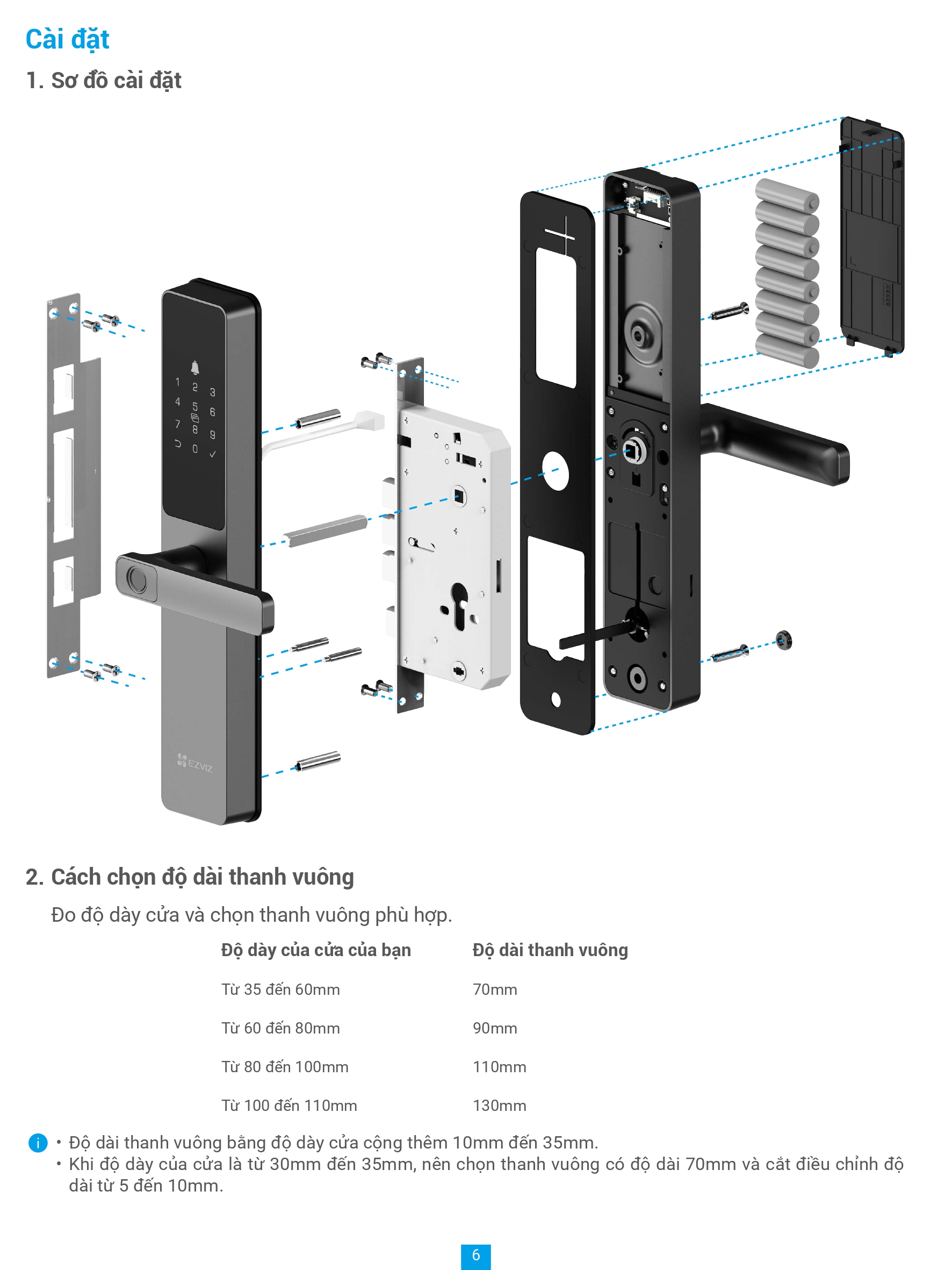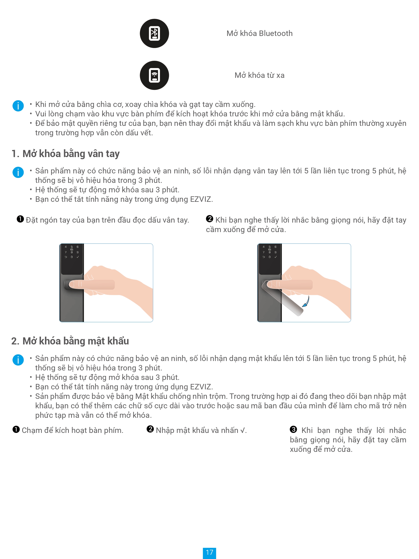 | Phương thức mở khoá | Vân tay, mật mã, thẻ cảm ứng, chìa cơ, chìa bluetooth qua ứng dụng EZVIZ, mã tạm thời, mở khóa từ xa |