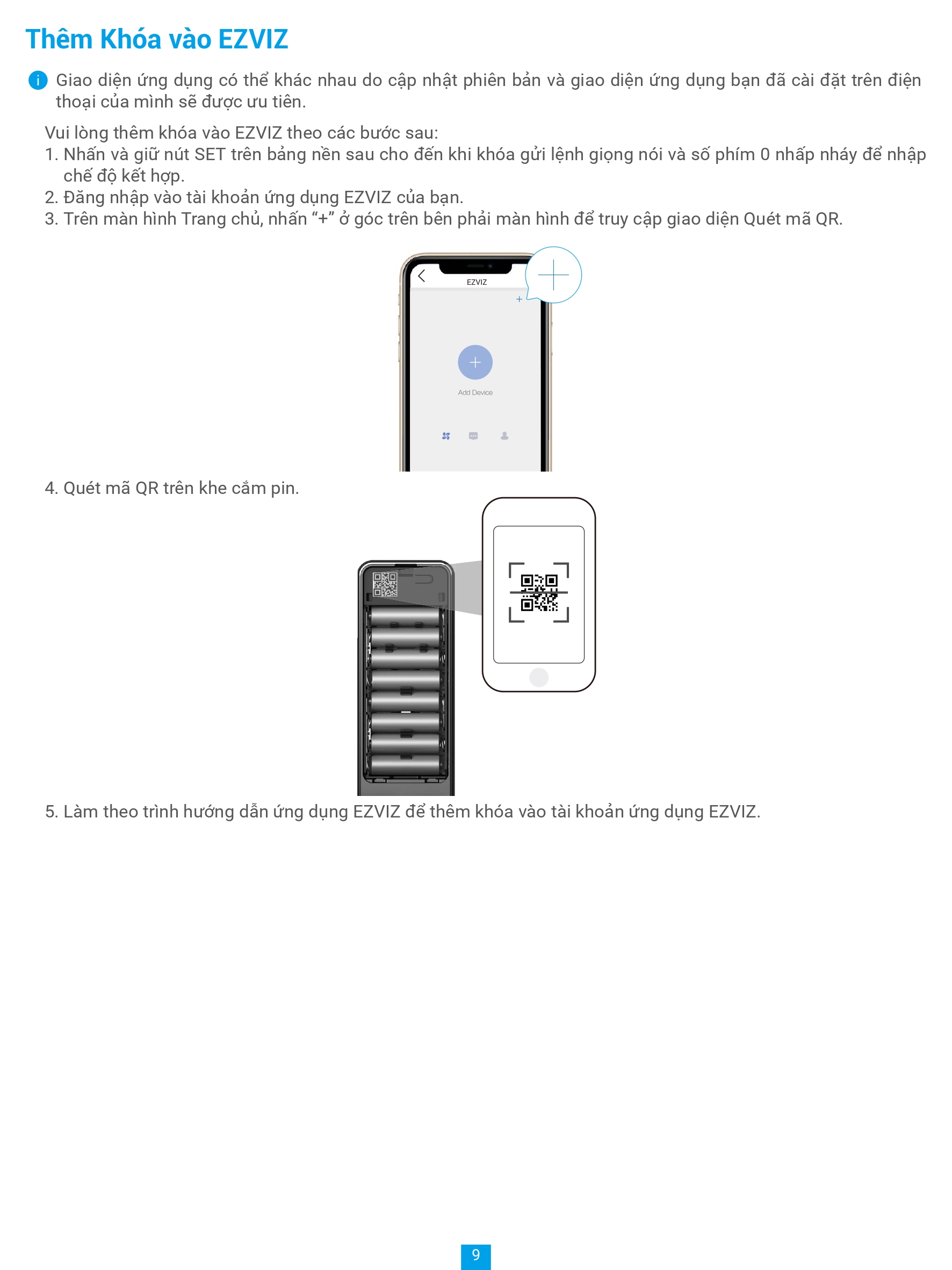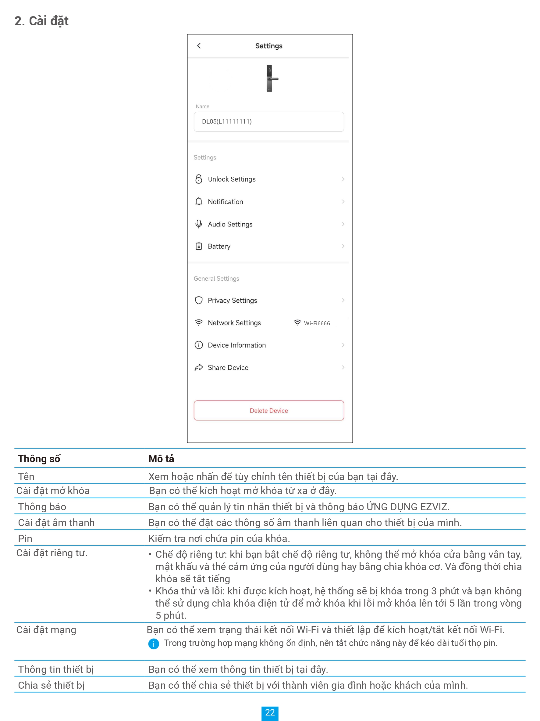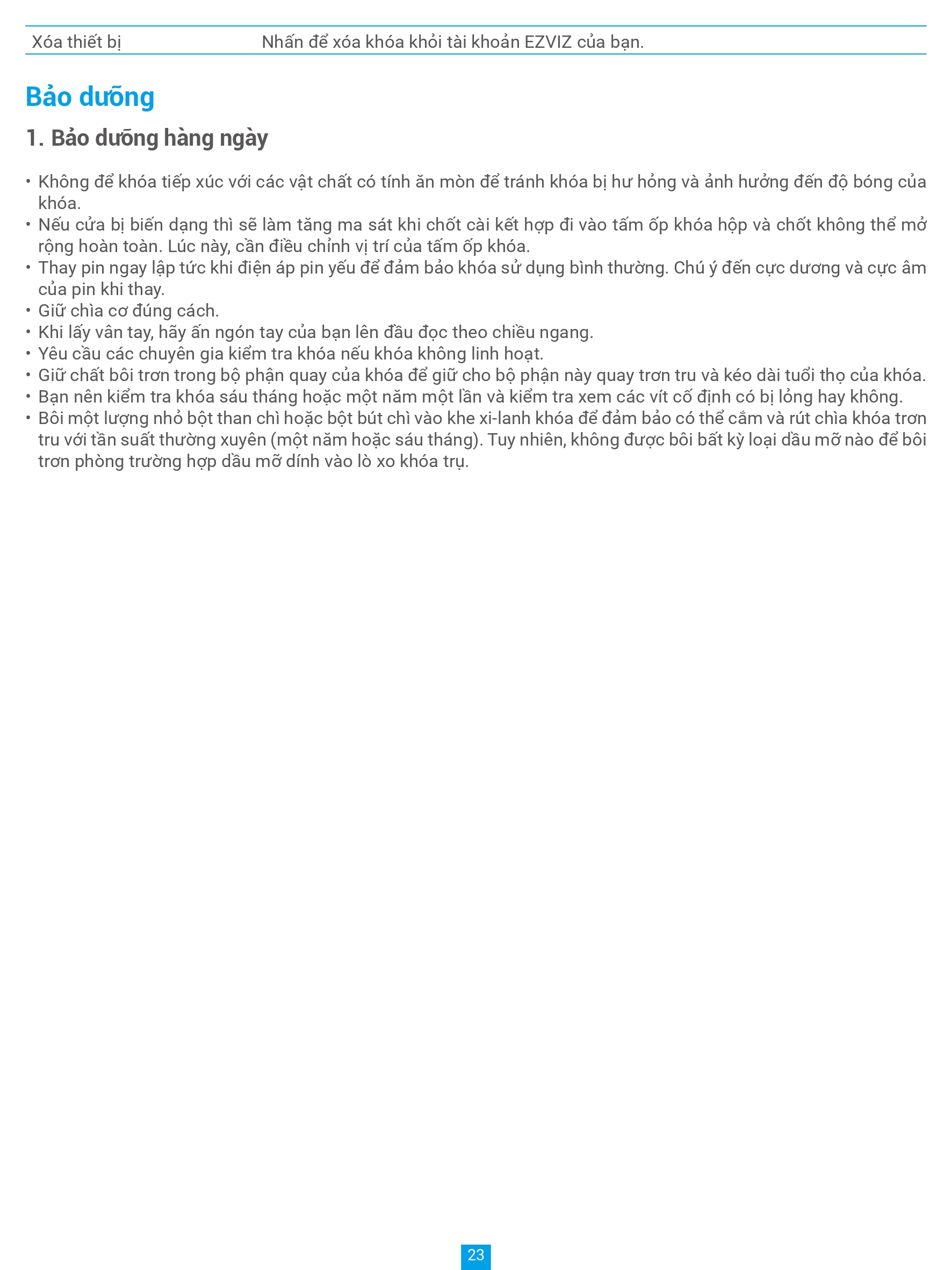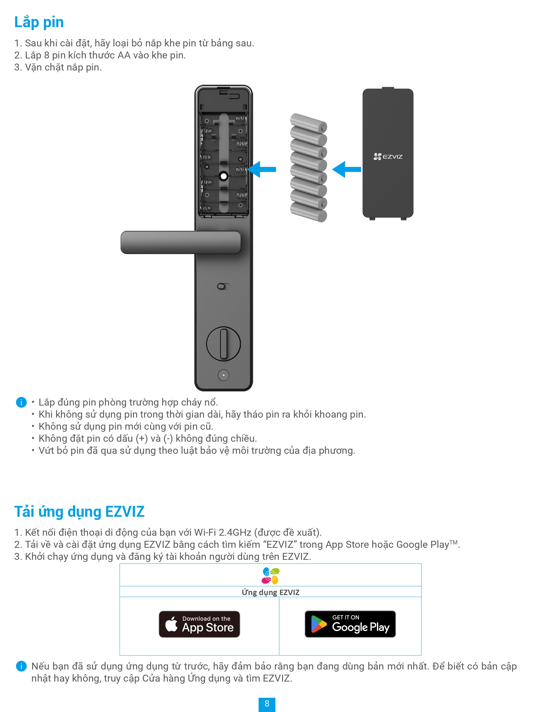 | Phương thức mở khoá | Vân tay, mật mã, thẻ cảm ứng, chìa cơ, chìa bluetooth qua ứng dụng EZVIZ, mã tạm thời, mở khóa từ xa |