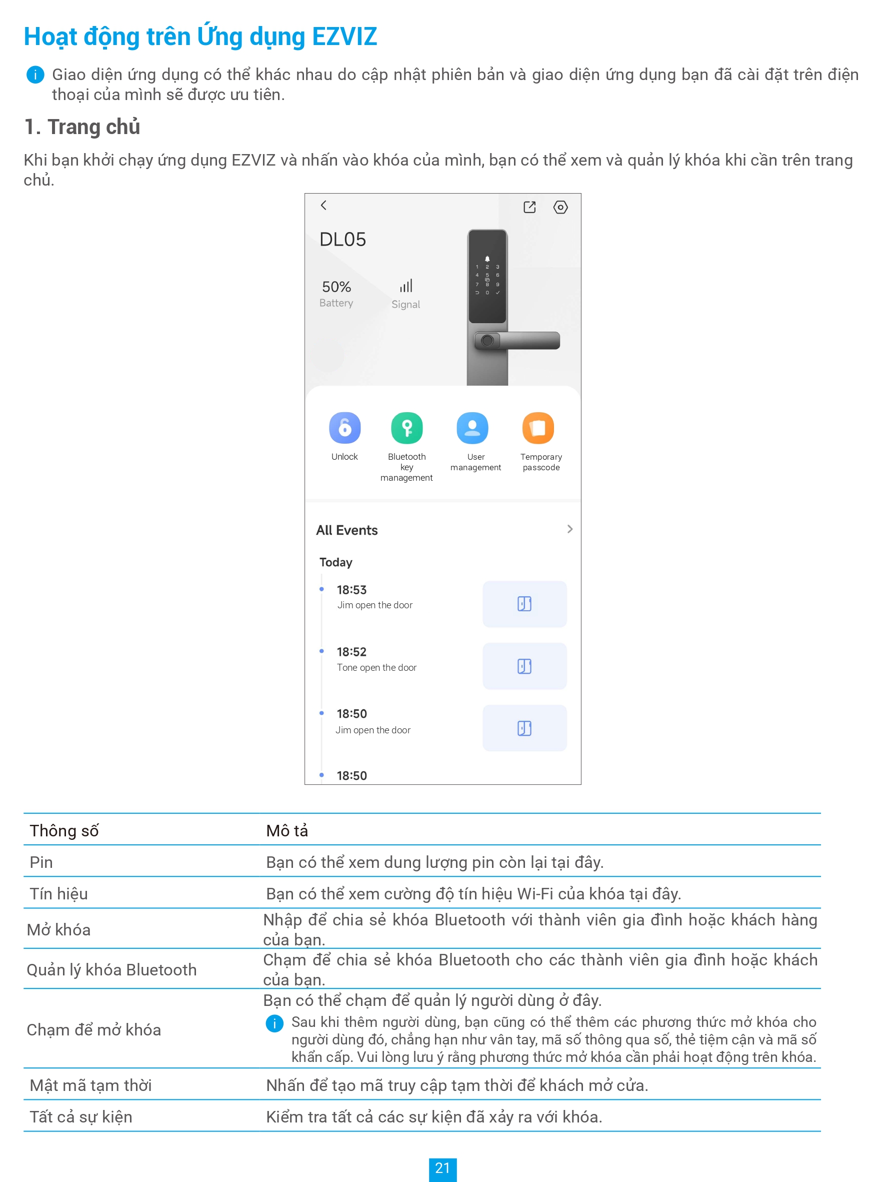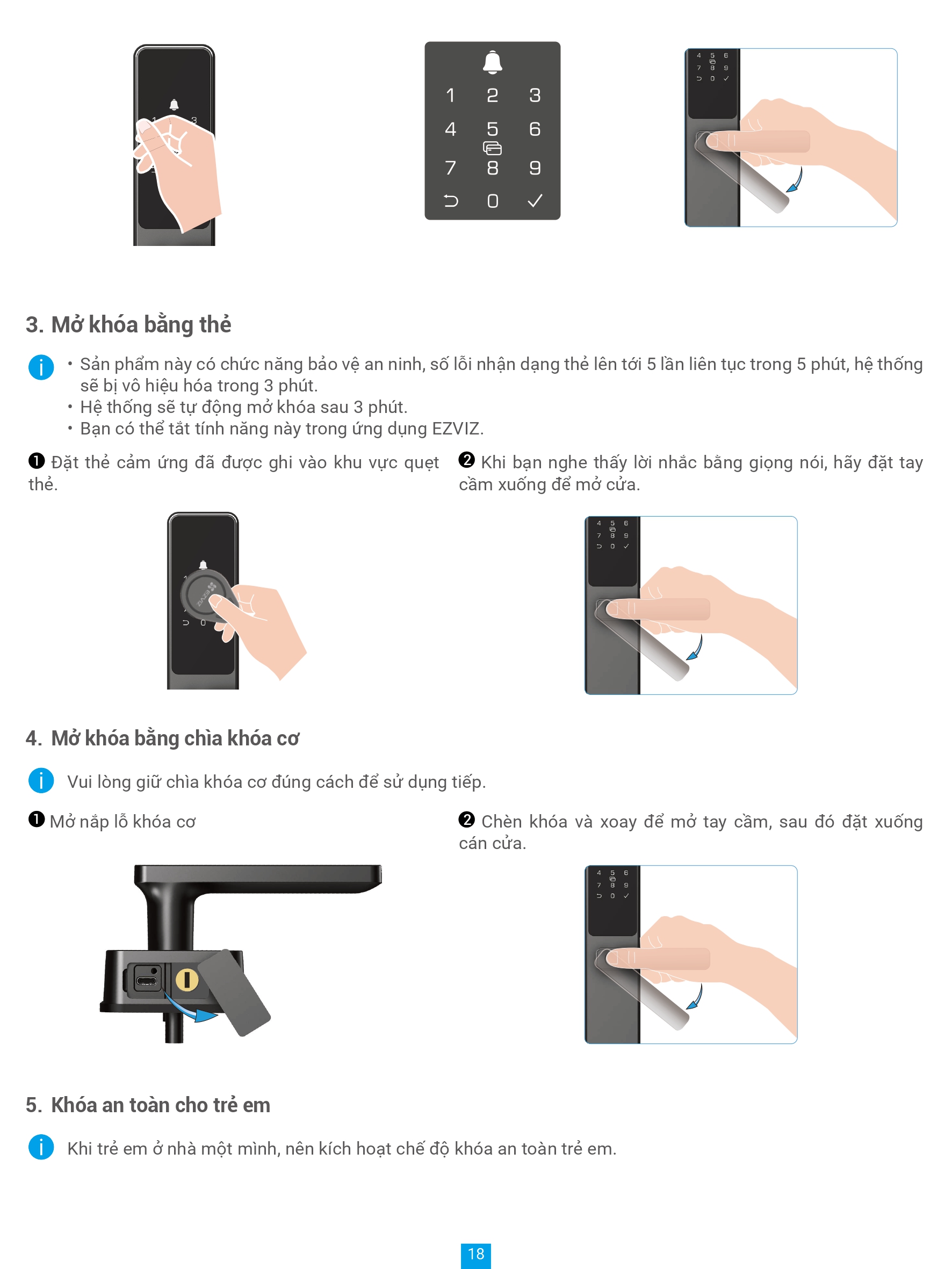 • Nhiều chế độ mở khóa: Vân tay, mật mã, thẻ cảm ứng, chìa cơ, chìa bluetooth qua ứng dụng EZVIZ, mã tạm thời, mở khóa từ xa